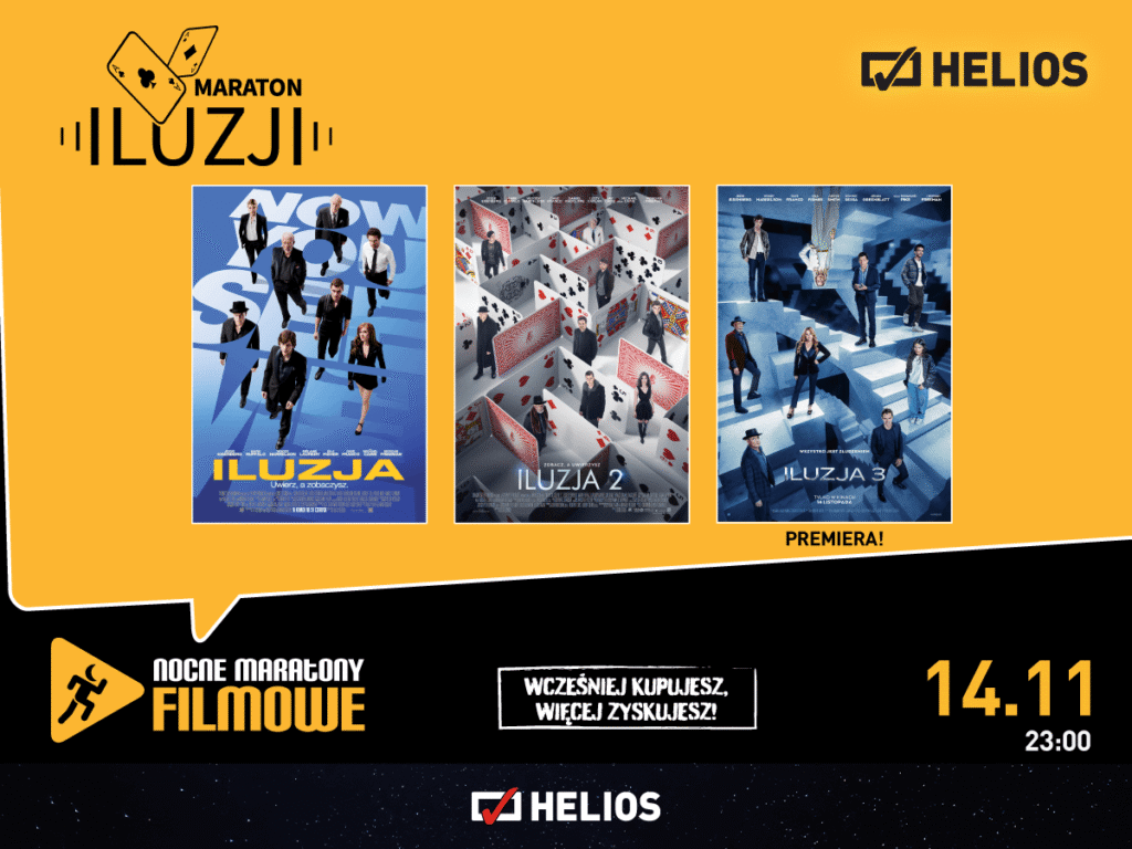 Kina Helios słyną z organizacji popularnych Nocnych Maratonów Filmowych, a najbliższa edycja cyklu będzie w pełni poświęcona serii „Iluzja”! W piątek, 14 listopada w całej sieci odbędzie się Maraton Iluzji – w czasie wydarzenia zostaną zaprezentowane wszystkie części przygód obdarzonych niezwykłymi umiejętnościami iluzjonistów, w tym gorąca premiera, „Iluzja 3”.