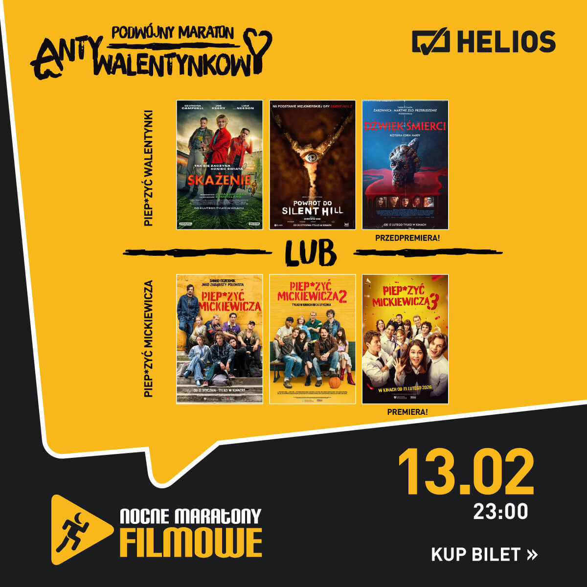Z okazji Walentynek, w piątkowy wieczór – 13 lutego – odbędą się dwa specjalne Nocne Maratony Filmowe. Maraton „Piepzyć Mickiewicza” to wydarzenie dla fanów serii, w ramach którego zaprezentowane zostaną wszystkie części, w tym premierowo jej trzecia odsłona. Alternatywą dla klasycznego świętowania będzie Maraton „Piepzyć Walentynki” – noc filmowa z horrorem w roli głównej. To propozycja dla tych, którzy zamiast romantycznych historii wolą dreszcz emocji! W programie znalazły się trzy mroczne tytuły, które zagwarantują widzom noc pełną napięcia i grozy.