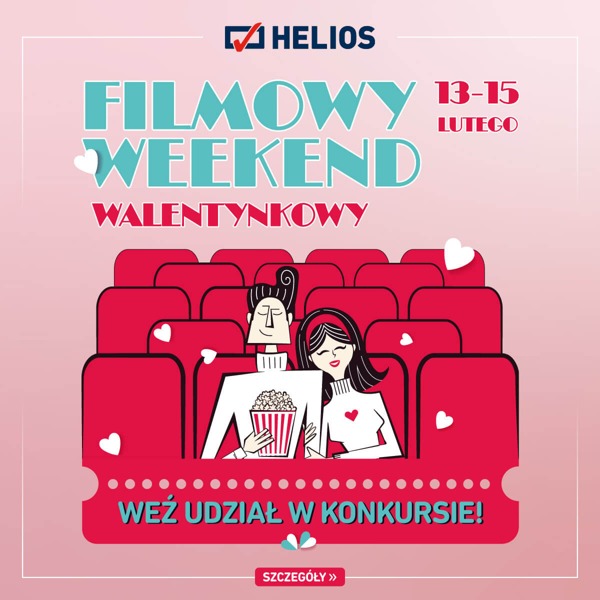 Helios zaprasza do udziału w walentynkowym konkursie! Na zwycięzcę czekają romantyczne chwile dla dwojga: kolacja w restauracji z gwiazdką Michelin oraz pobyt w pięciogwiazdkowym hotelu w centrum Warszawy. Aby zawalczyć o wygraną, wystarczy zrobić zdjęcie lub nagrać film, pokazując, jak spędzacie randkę w kinie Helios. Więcej informacji znajduje się pod linkiem: www.helios.pl/aktualnosc/walentynki.