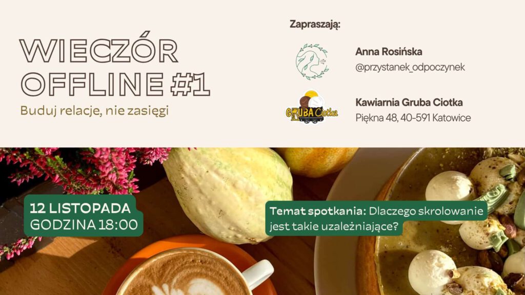 W kawiarni Gruba Ciotka odbędzie się pierwszy w regionie Wieczór Offline – wydarzenie, podczas którego uczestnicy na dwie godziny rezygnują z telefonu, by odzyskać spokój i uważność. W zamian czeka ich inspirujący czas w dobrym towarzystwie, kreatywne warsztaty i rozmowy o tym, jak świadomie korzystać z technologii.