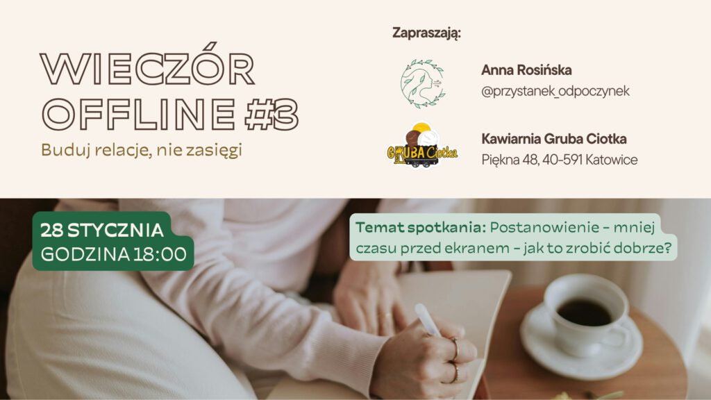Wieczór Offline #3 w Katowicach. Mniej telefonu, więcej rozmowy W świecie, w którym niemal cały czas jesteśmy online, coraz częściej pojawia się potrzeba zatrzymania się i prawdziwego kontaktu z drugim człowiekiem. Bez powiadomień, bez scrollowania, bez presji bycia na bieżąco. Odpowiedzią na tę potrzebę jest Wieczór Offline #3 w Katowicach. To spotkanie dla osób, które … Czytaj dalej Wieczór Offline #3 w Katowicach. Mniej telefonu, więcej rozmów